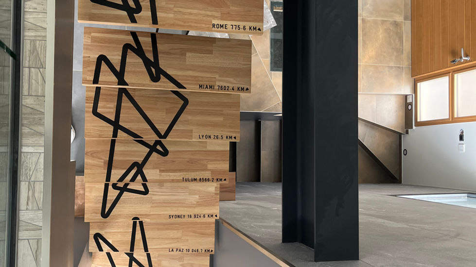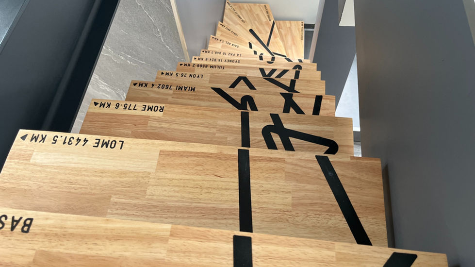 We suggested adding a personal touch by engraving on each step the names of the cities they have visited around the world, accompanied by the direction and distance in kilometers, calculated geodesically.